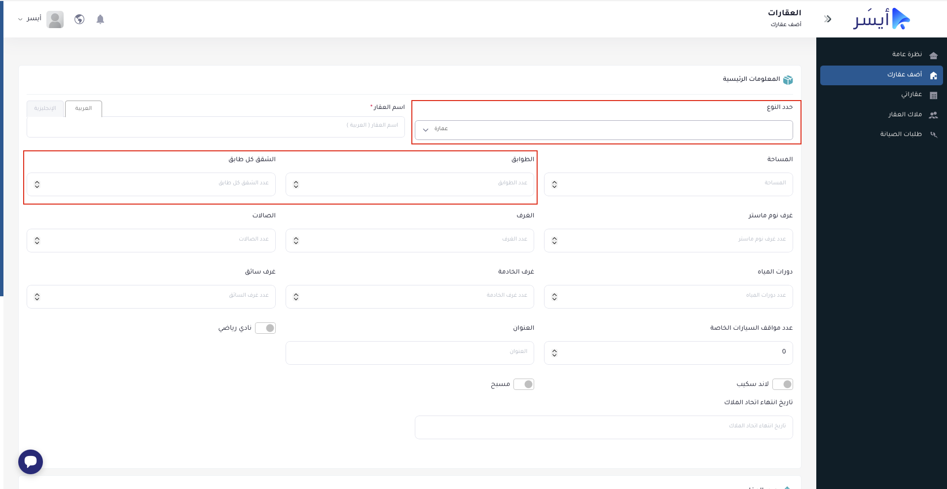 عليك الان ملاء جميع البيانات لكي يظهر عقارك بشكل المناسب وتأكد من إختيار نوع عمارة وقم بتسجيل عدد لطوابق وعدد الشقق لكل طابق