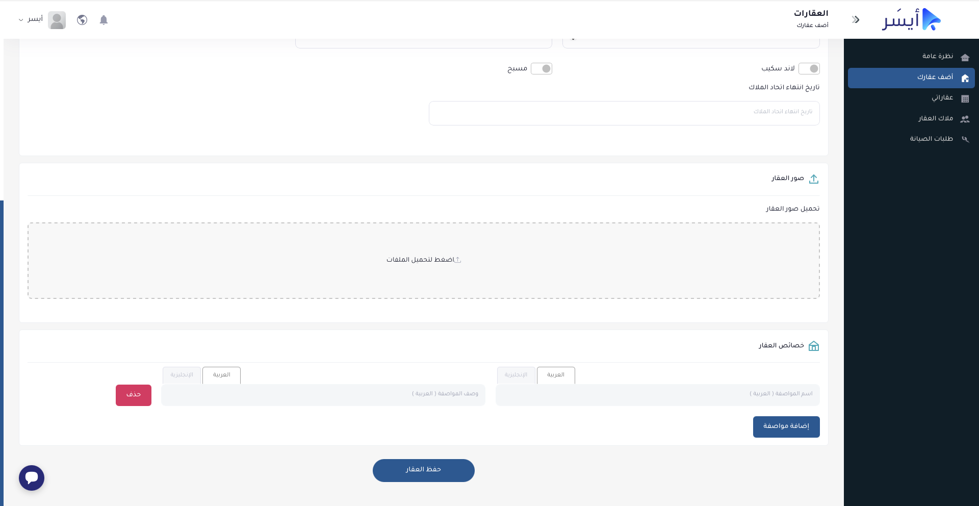 ايضا تأكد من الضغط على زر الإنجليزية وإضافة اسم المشروع بالانجليزية وخانة صور العقار قم برفع كل الصور للمشروع وقم بوضع اول صورة الصورة التي ترغب في ان تكون الصورة الاساسية للمشروع في تطبيق