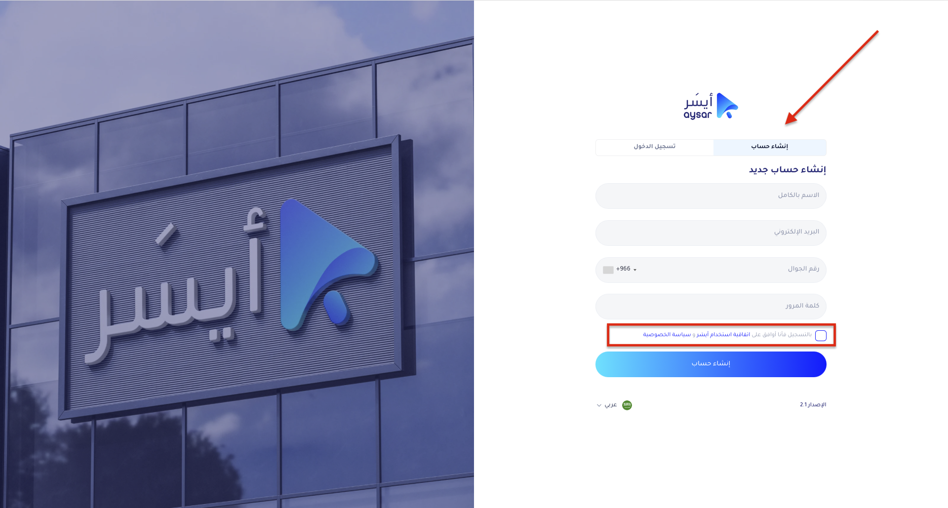 ابدأ بملء المعلومات المطلوبة، ثم اقرأ اتفاقية استخدام أيسر ووافق على الشروط.