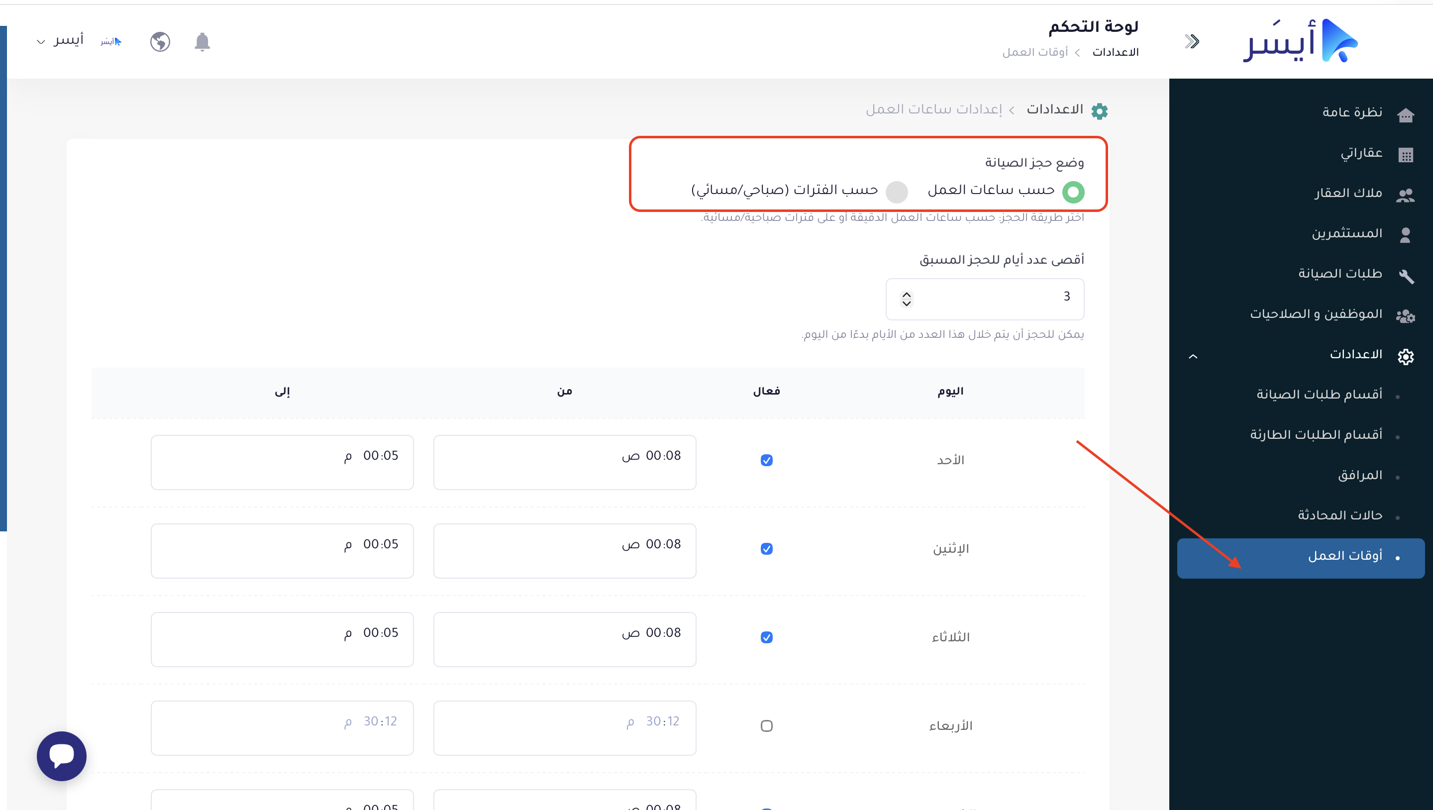 بعد اختيار النظام، قم بإعداد وإدخال المعلومات التي تظهر لك مثل أيام العمل، أوقات الدوام، وعدد الطلبات (السعة) التي ترغب باستقبالها في كل فترة، وذلك لتنظيم جدول الصيانة حسب طاقة فريقك.